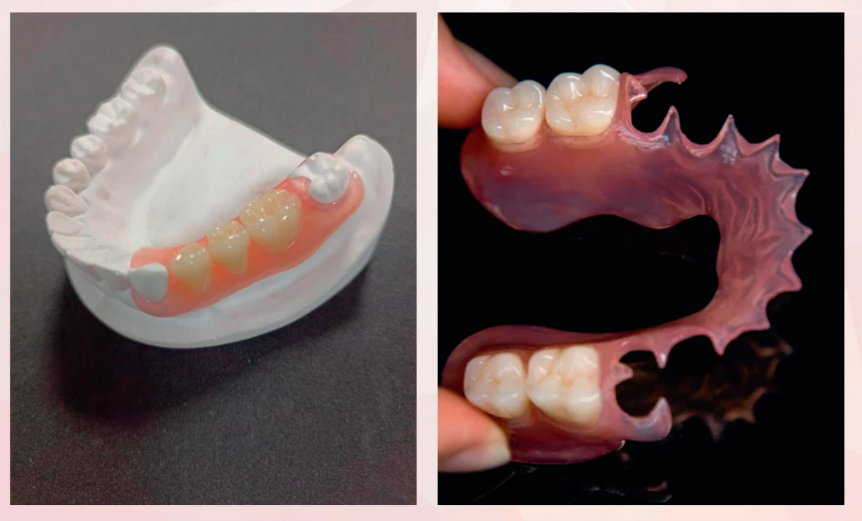 TCS glue is used as the manufacturing material, which has good biocompatibility. Since the elastic transparent glue resin clasp is located on the labial and buccal side of the abutment tooth and the crown neck, it does not damage the nipple and is beneficial to the periodontal health of the abutment tooth; the surface is well polished and not easy to stain, and has a certain high strength and can withstand normal bite force.